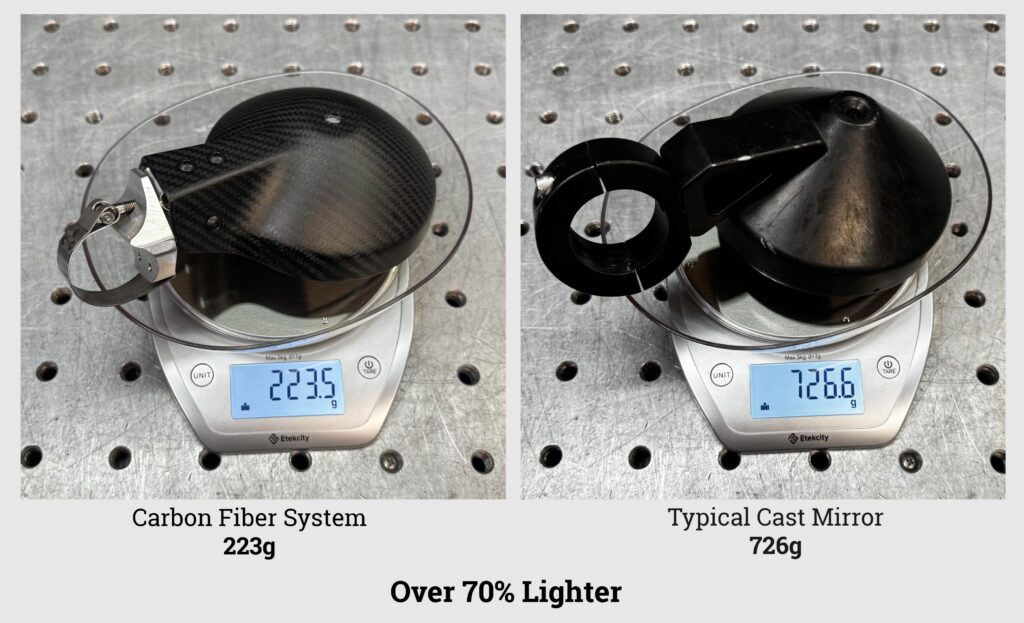 A complete mirror assembly with our 1.5″ tube wrap mount weighs just 223 grams—compared to 726 grams for a typical cast aluminum mirror.
